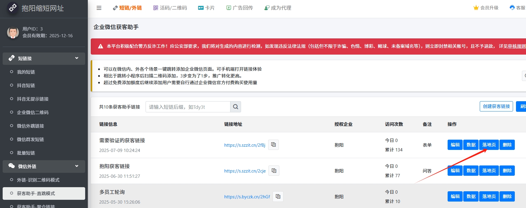 选择【短链/外链】-【获客助手-直跳模式】,这里新建链接,详细操作步骤