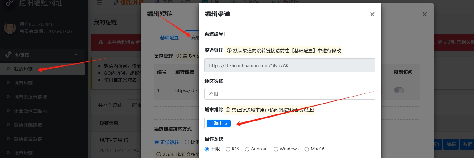 1. 如果需要屏蔽具体某些城市,可以使用我的短链功能设置屏蔽的城市.详细操作步骤